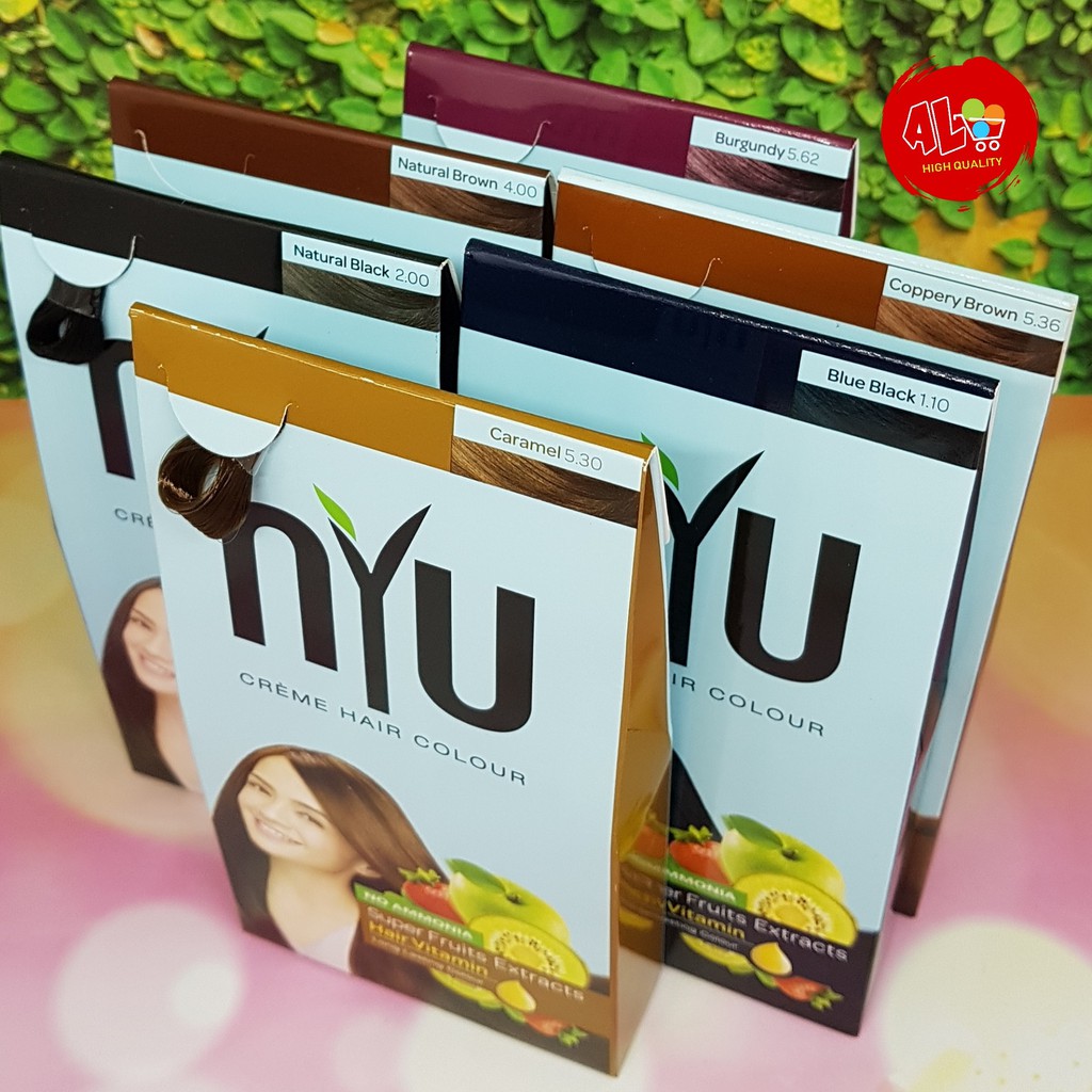 Cat rambut merk Nyu ini bebas ammonia dan diperkaya oleh super fruit extract yang berfungsi untuk melindungi rambut dari masalah iritasi kulit kepala akibat proses pewarnaan rambut Merk ini berasal dari India tepatnya diproduksi di Godrej Consumer Products Ltd 52 BIP yang di impor ke Indonesia oleh PT Megasari Makmur dan juga sudah memiliki BPOM dari Departemen Kesehatan
